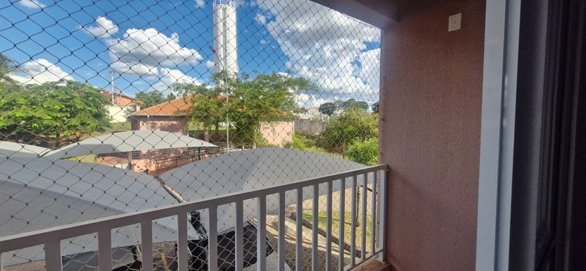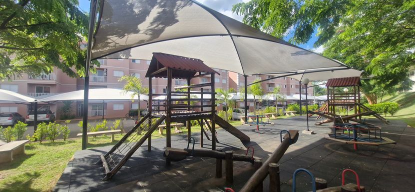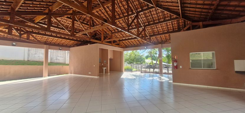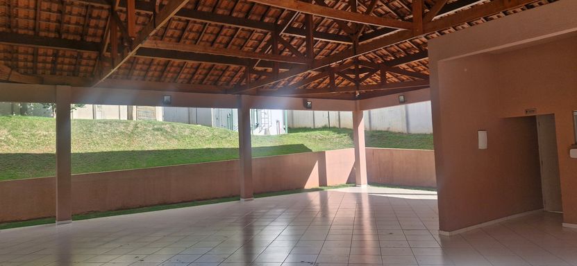 Condomínio com salão de festas, minimercado, playground e quadra de areia.