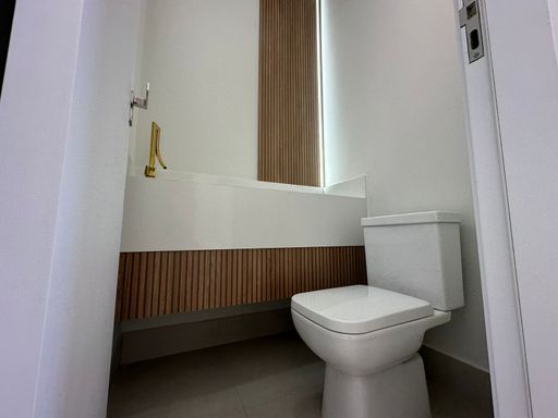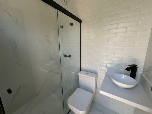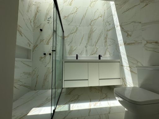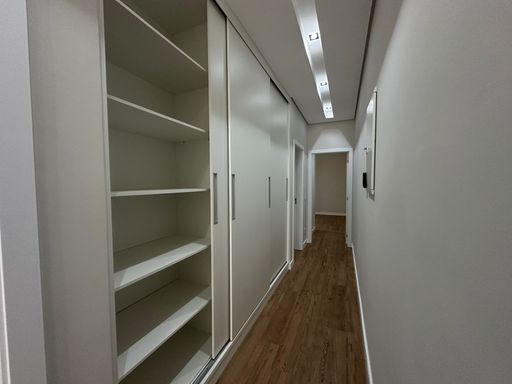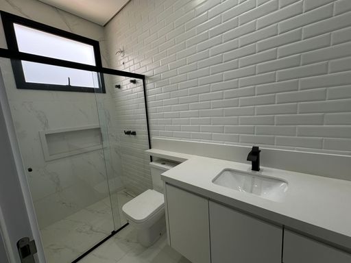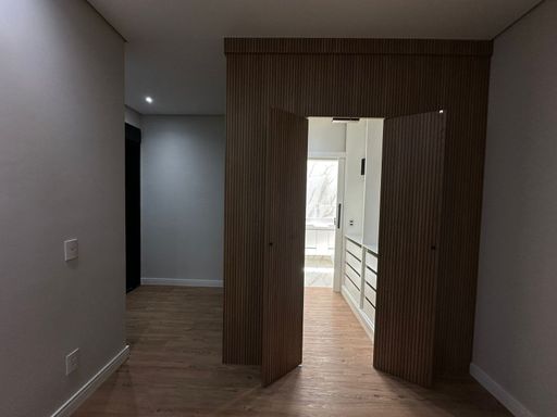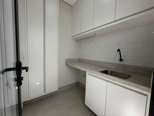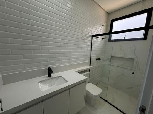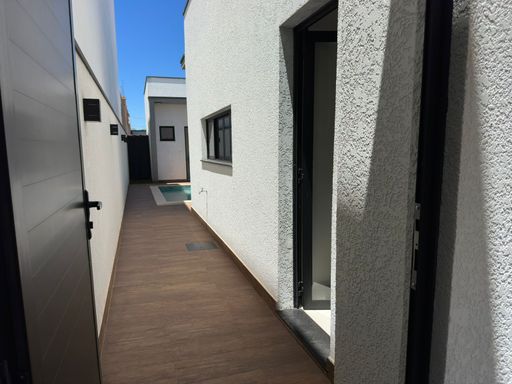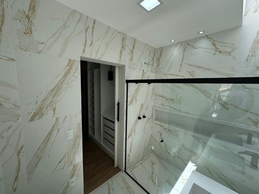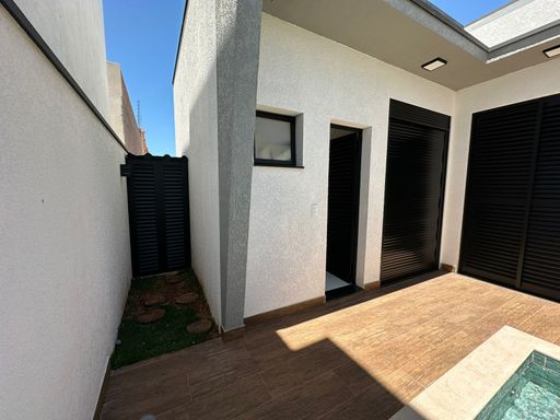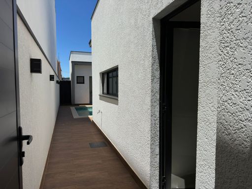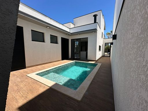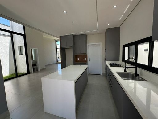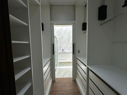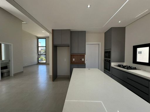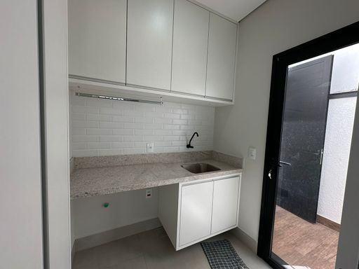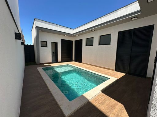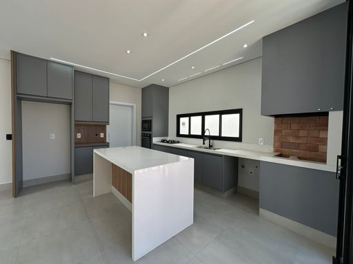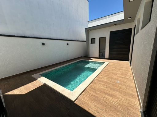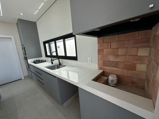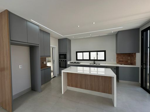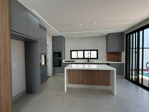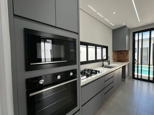 São 3 suítes com armários planejados, living com pé direito duplo, cozinha estilo americana com ilha e churrasqueira, quintal com piscina.