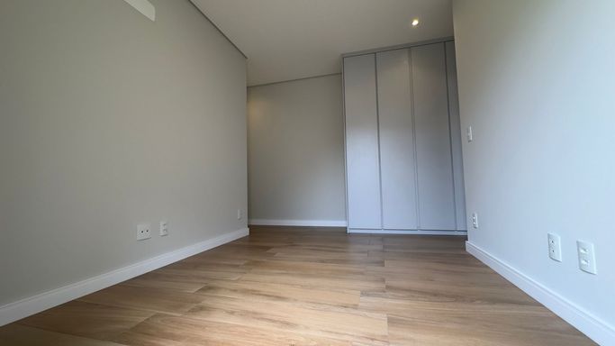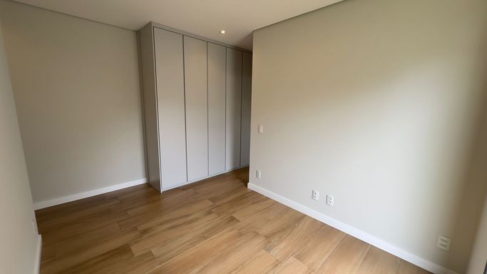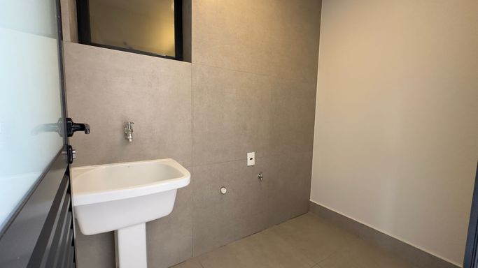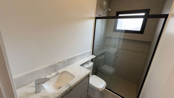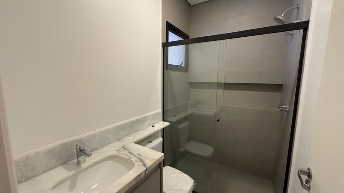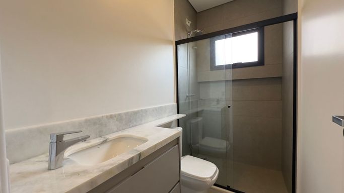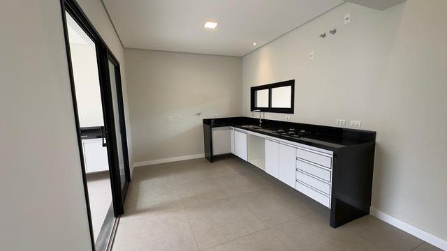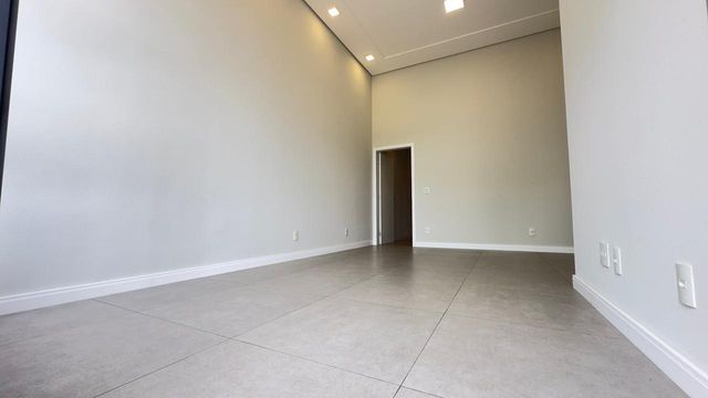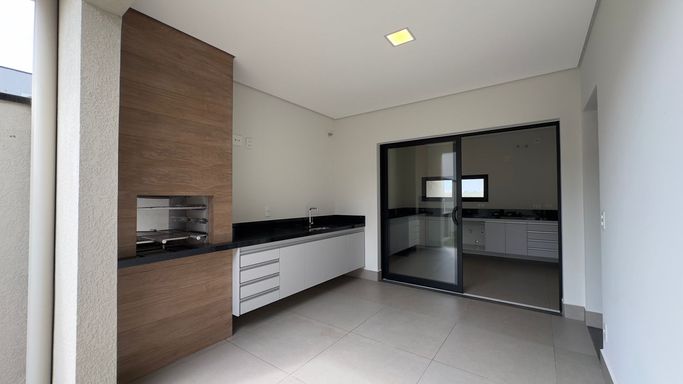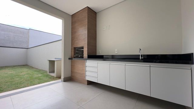 São 3 quartos, sendo 3 suítes (sendo 1 banheiro reversível para social), living com pé direito duplo, cozinha americana, varanda gourmet com churrasqueira e quintal gramado.