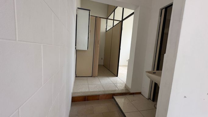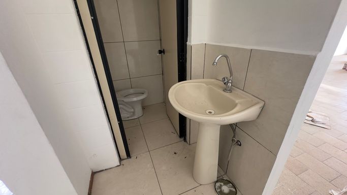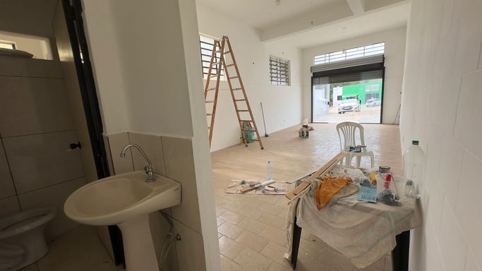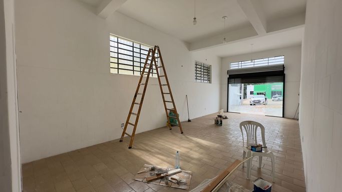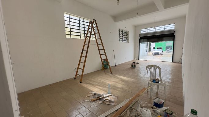 Salão amplo com 80m², 2 banheiros.